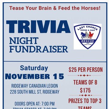 Back by popular demand, we will be hosting a Trivia Night Fundraiser Sat. November 15th at the Ridgeway Legion.