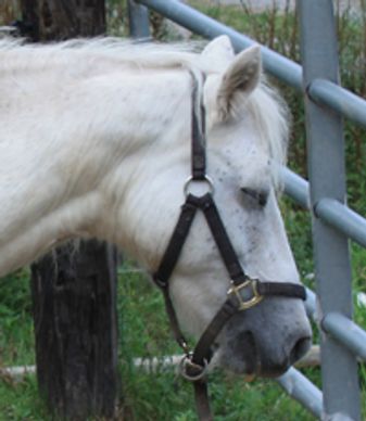 Apple is a white pony who arrived shortly after Spirit. Apple was terribly abused and pregnant when she arrived. The foal had to be taken from her as she was bred to a much larger horse that would have been too large to deliver. Apple's best friend Spirit assisted her in being social and in trusting people again. Unfortunately Spirit crossed The Rainbow Bridge June 2024. Apple is lost and needs more attention today. More than ever.