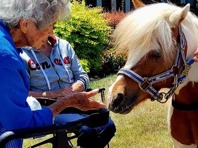 Mickey arrived Feb 16, 2023. He was a Show Jumper and is no longer physically able to do so. Since the moment he arrived, Mickey has been eager to please and certainly shines in the spotlight. He is charismatic. So much so he has drawn the attention of all the mares in the barn! He shares himself with therapeutic visits to Retirement Homes, Long-term Care facilities and offers his shined personality to the group programs that visit us.