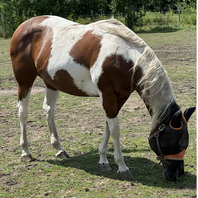 Finnigan was surrendered by his owner, and came to us in spring of 2025. Finnigan was former show horse but because of a serious injury that couldn’t be rehabilitated, his show days were over and his owner wanted to find him a good retirement home